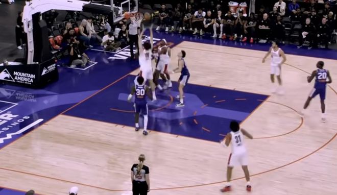 但到了比赛时间更长,节奏更快,回合数更多,对抗更激烈的G联赛,加上他已两周未参加正式比赛,没有比赛感觉,本场仍成功顶住了30分钟的高强度对抗,甚至是第四节结束后体能还有余份。这不就是体能正在变好,进步的体现。