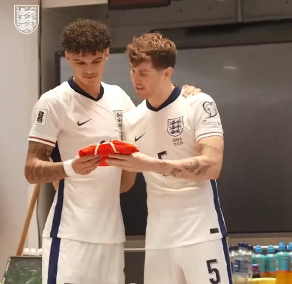 在赛后的更衣室内,尼科-奥赖利从英格兰队和曼城双料队友斯通斯手中接过纪念帽,包括图赫尔、球员以及工作人员都为他送上掌声。
